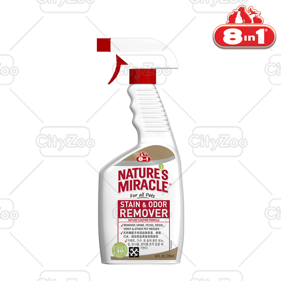 Bình xịt Nature's Miracle Stain & Odor Remover đảm bảo loại bỏ hoàn toàn mùi nước tiểu, phân, nước dãi và những vết bẩn khác của vât cưng trên thảm, sàn nhà, đồ đạc, quần áo...