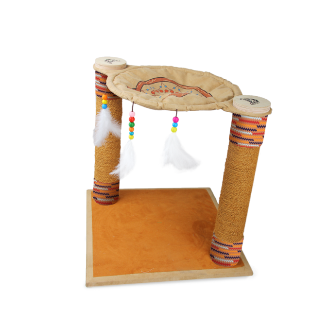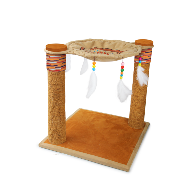 Cây mèo leo kèm võng dành cho những chú mèo thích vận động. Dây quấn trụ được làm bằng xơ dừa thân thiện với móng. Võng gắn lông vũ, chuỗi hạt tăng cường hoạt động vui chơi cho mèo.