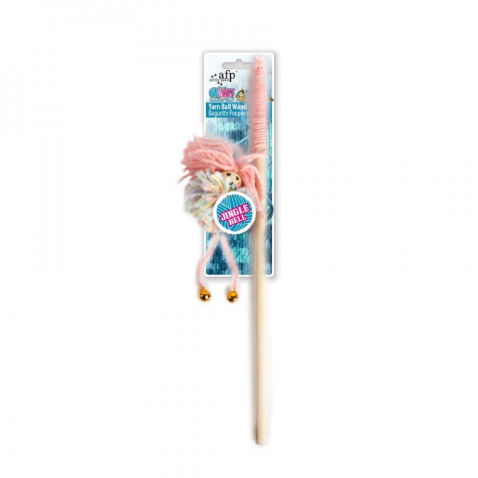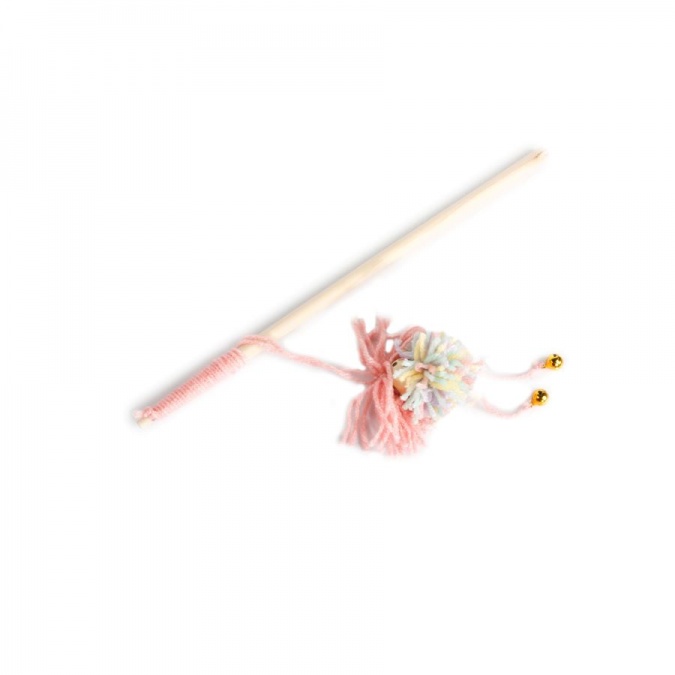 Cần câu hình cuộn len tròn, có chuông bên trong giúp mèo thích thú hơn với đồ chơi và hoạt động đuổi bắt cuộn len.