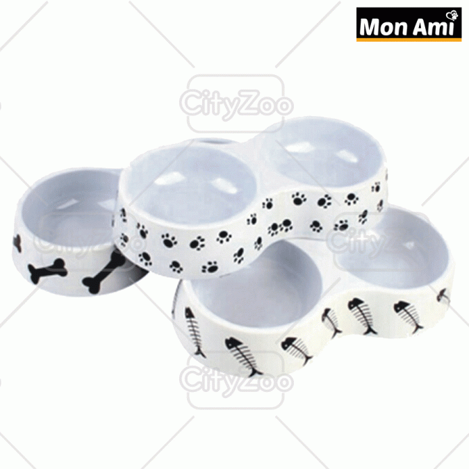 Sản phẩm chén đôi cho chó mèo được sản xuất từ nhựa melamine cao cấp và được trang trí nhiều hoa văn đẹp mắt.
