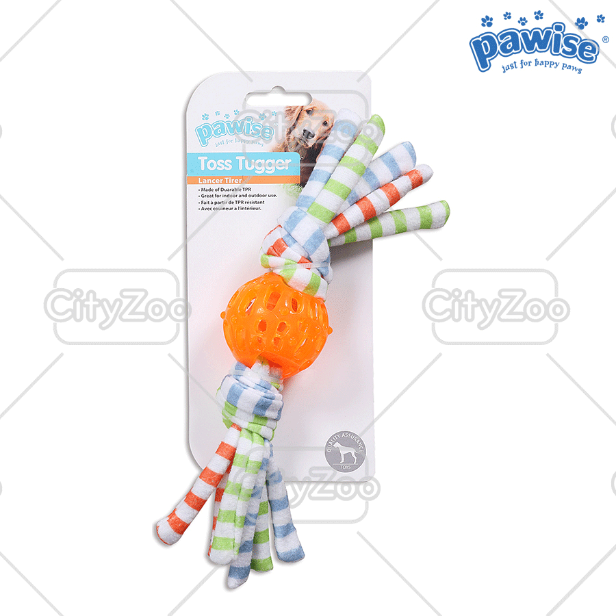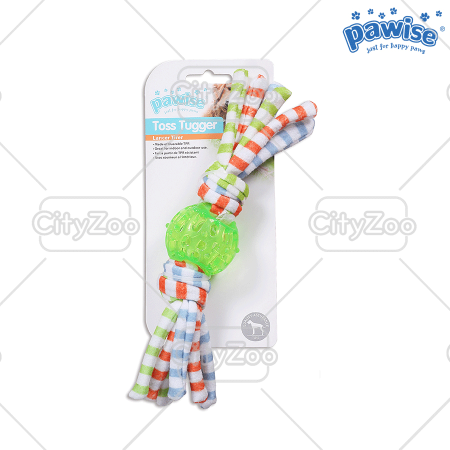 Bóng kéo co Toss của thương hiệu Pawise được thiết kế từ nhựa và dây thừng nhiều màu sắc đẹp mắt với chất liệu an toàn cho thú cưng cắn vào miệng.