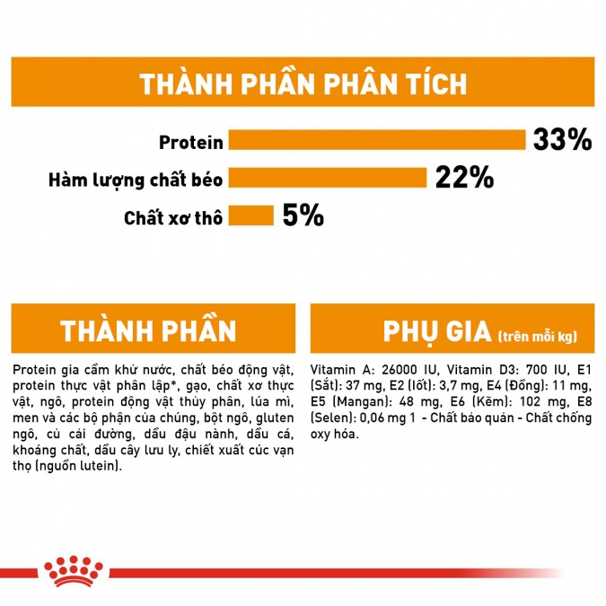 Protein gia cầm, chất béo động vật, protein thực vật*, gạo, xơ thực vật, bắp, protein động vật, lúa mì, men, bột bắp, gluten bắp, củ cải đường, dầu đậu nành, dầu cá, khoáng chất, dầu borage, chiết xuất cúc vạn thọ (nguồn lutein).