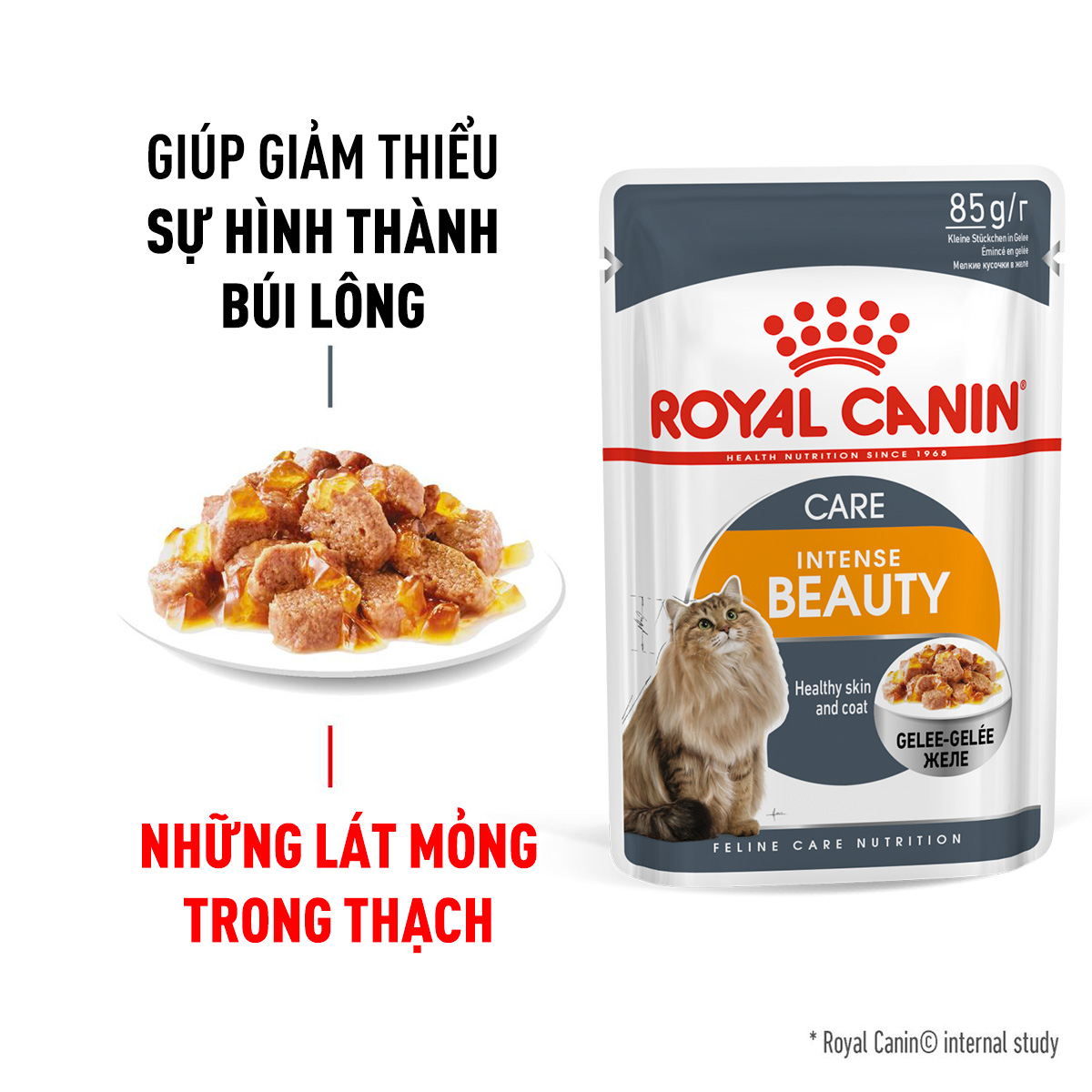 ROYAL CANIN Hairball Care Wet hỗ trợ sức khỏe của mèo bằng cách cung cấp dinh dưỡng chính xác dựa trên sự hiểu biết tường tận về nhu cầu của mèo với hơn 40 năm nghiên cứu và quan sát. Đặc biệt nhờ Protein L.I.P tiêu hóa cao hỗ trợ búi lông.