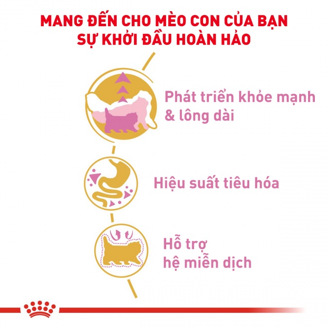 Mèo Ba Tư con cần loại hạt được thiết kế đặc biệt theo kích cỡ và kết cấu của chúng để dễ dàng đưa thức ăn vào miệng. Các hạt ROYAL CANIN Persian Kitten với hình thù độc đáo khuyến khích mèo nhai kỹ hơn nhờ đó giúp hỗ trợ vệ sinh răng miệng.
