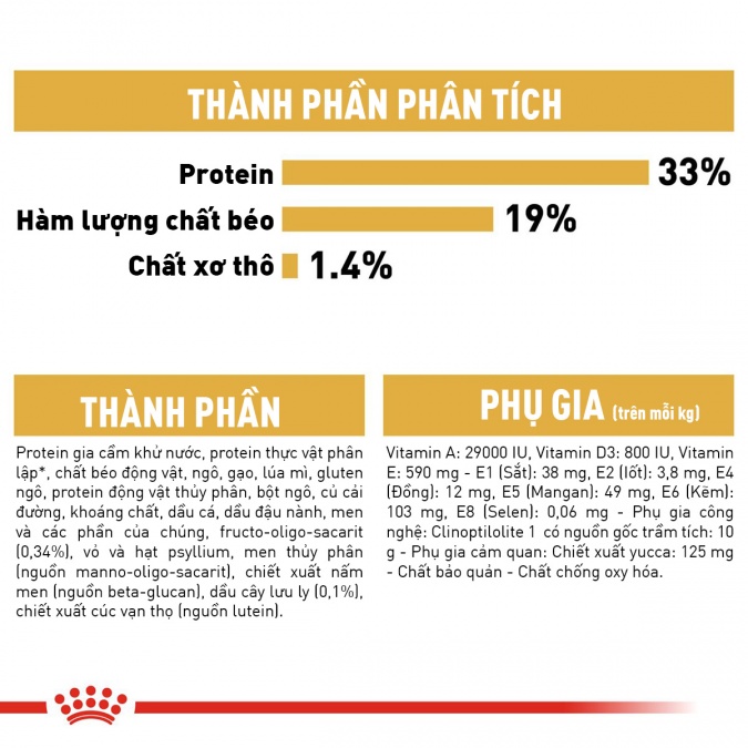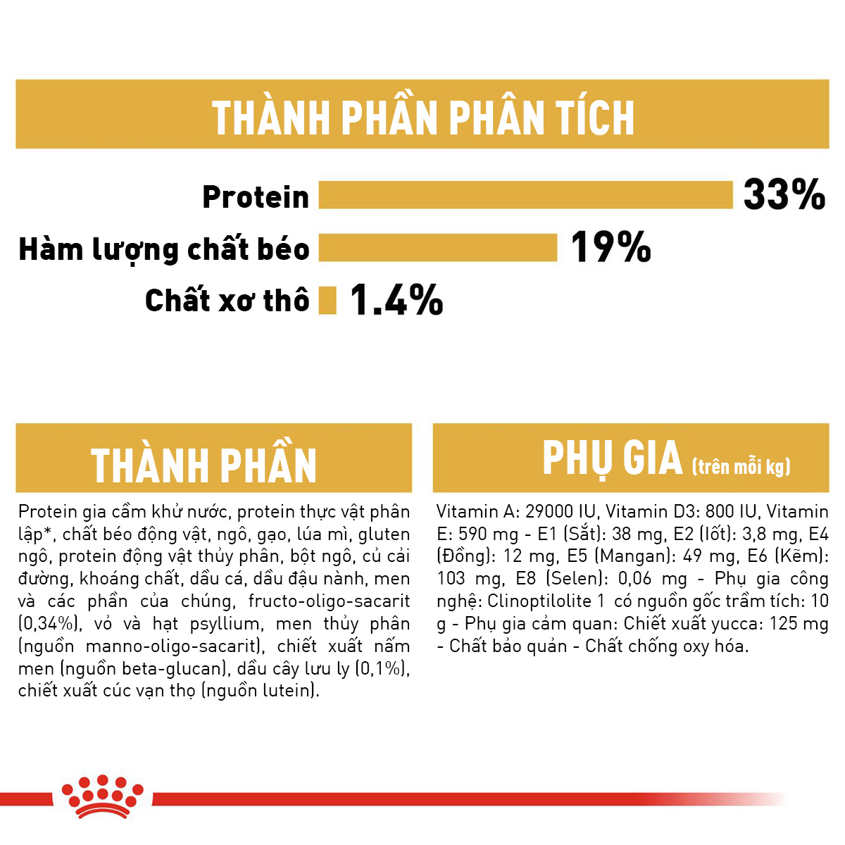 Protein gia cầm, protein thực vật*, chất béo động vật, gạo, lúa mì, gluten bắp, protein động vật, bột bắp, củ cải đường, khoáng chất, dầu cá, dầu đậu nành, men, fructo-oligo-sacarit (0,34%), psyllium, nấm men thủy phân (nguồn manno-oligo-sacarit), chiết xuất nấm men (nguồn betaglucan), dầu borage (0,1%). chiết xuất cúc vạn thọ (nguồn lutein).