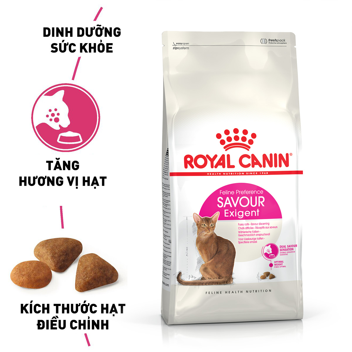 Chúng ta thường bắt gặp các trường hợp mèo kén ăn, đó là do khứu giác của mèo rất phát triển nên đặc biệt nhạy cảm với mùi thơm. Royal Canin Savour Exigent Dry với công thức được đặc biệt phát triển giúp kích thích sự thèm ăn ở mèo, kể cả đó là mèo kén ăn nhất. Sản phẩm kết hợp hai loại hạt với kết cấu, thành phần và hình dạng khác nhau, cùng mùi vị hấp dẫn tạo nên bữa ăn hoàn hảo, kích thích mọi giác quan của mèo.