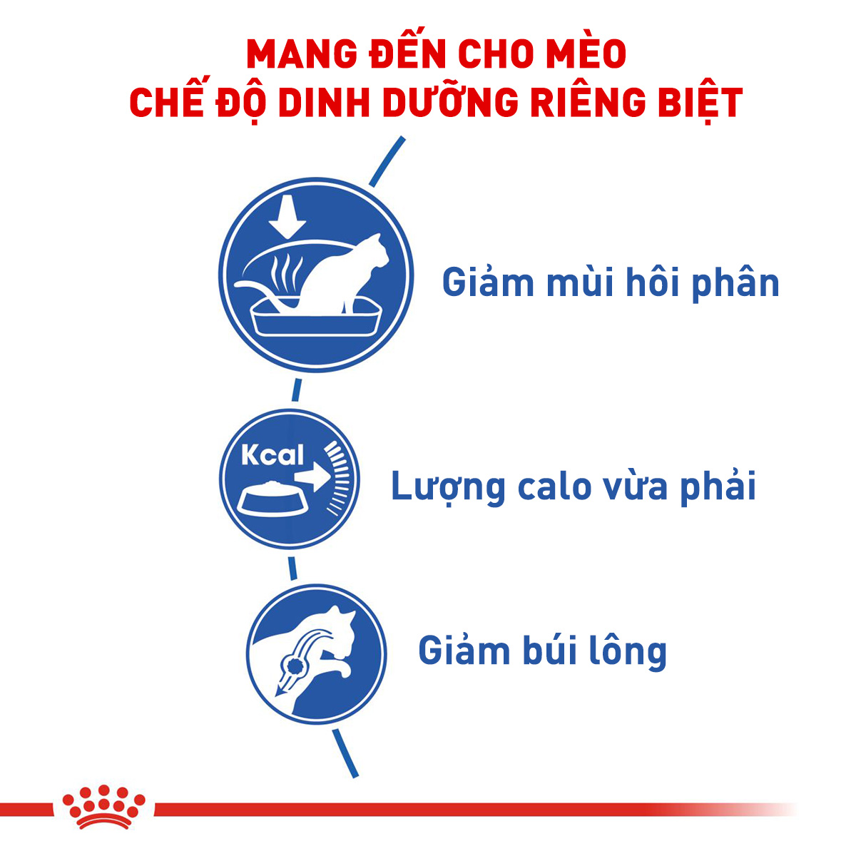 Thức ăn cho mèo ROYAL CANIN Indoor hỗ trợ sức khoẻ của mèo bằng cách cung cấp dinh dưỡng chính xác dựa trên sự hiểu biết đúng đắn về các nhu cầu cụ thể với hơn 40 năm nghiên cứu. Mèo sống trong nhà có lối sống ít vận động, nhu cầu năng lượng thấp hơn và nguy cơ béo phì cao hơn nên thức ăn cần hỗ trợ được những vấn đề sau: