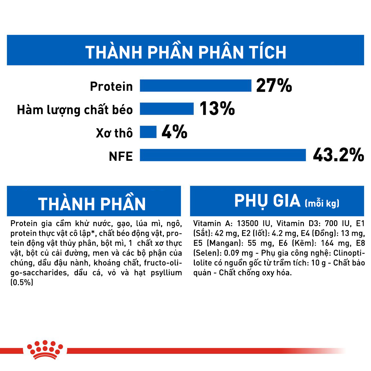 Protein gia cầm, gạo, lúa mì, bắp, protein thực vật*, chất béo động vật, bột lúa mì, xơ thực vật, củ cải đường, men, dầu đậu nành, khoáng chất, fructo-oligo-sacarit, dầu cá, psyllium (0,5%).