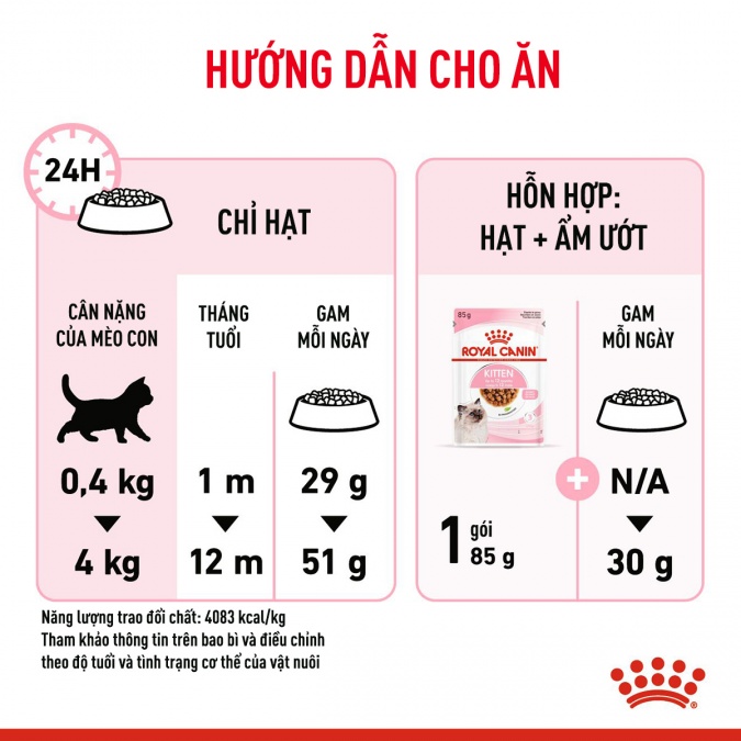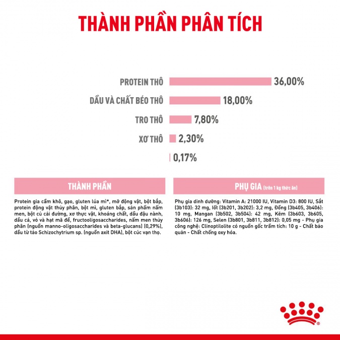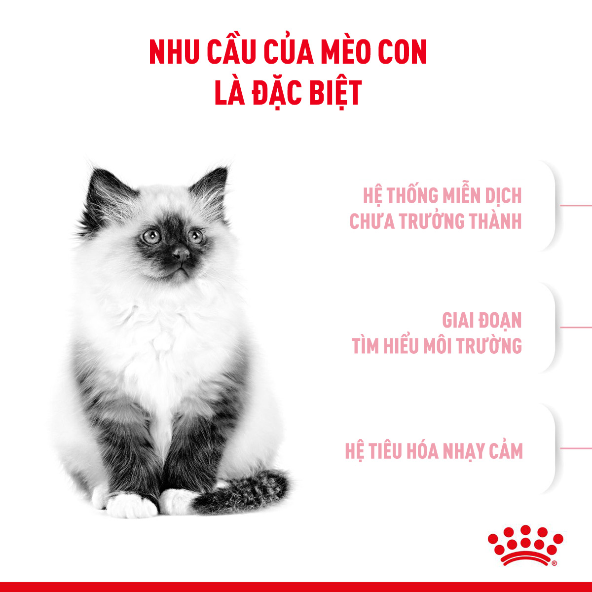 Thức ăn cho mèo con ROYAL CANIN Kitten hỗ trợ sức khỏe của mèo con bằng việc cung cấp các chất dinh dưỡng chính xác dựa trên nghiên cứu của các nhà khoa học từ ROYAL CANIN. Trong giai đoạn tăng trưởng, hệ thống tiêu hóa của mèo con chưa phát triển đầy đủ, chính vì vậy ROYAL CANIN Kitten thúc đẩy sự cân bằng hệ vi sinh đường ruột, hỗ trợ sự phát triển khỏe mạnh.